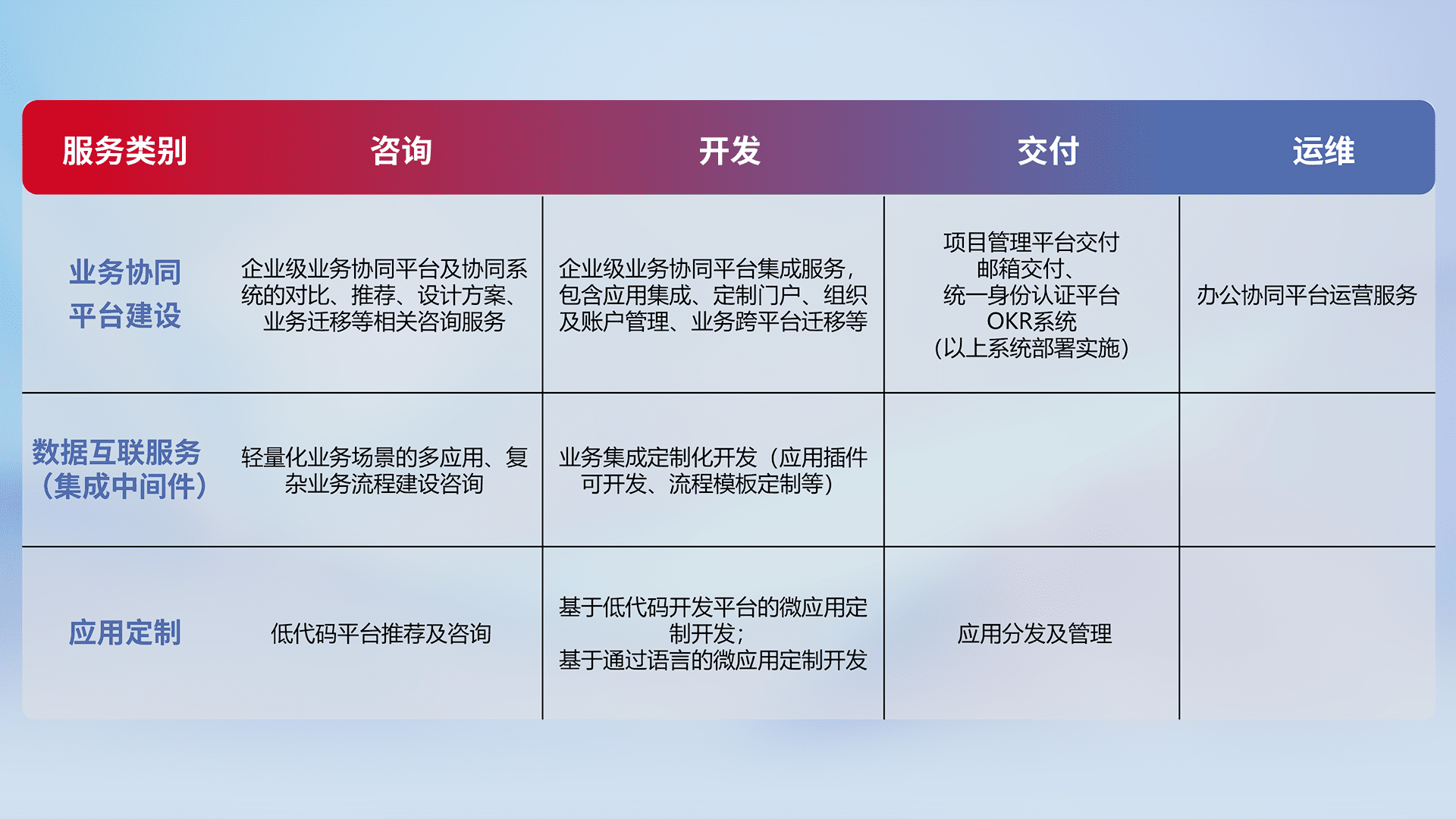针对钉钉、、企微、、、、IDaas等平台级产品提供产品的规划、、、方案、、、、交付、、定制化开发等服务,,,实现如统一协同办公、、、智能客户服务、、、混合会议管理、、、、智能数据查询、、、、等业务场景,,,实现数字化转型。。。。