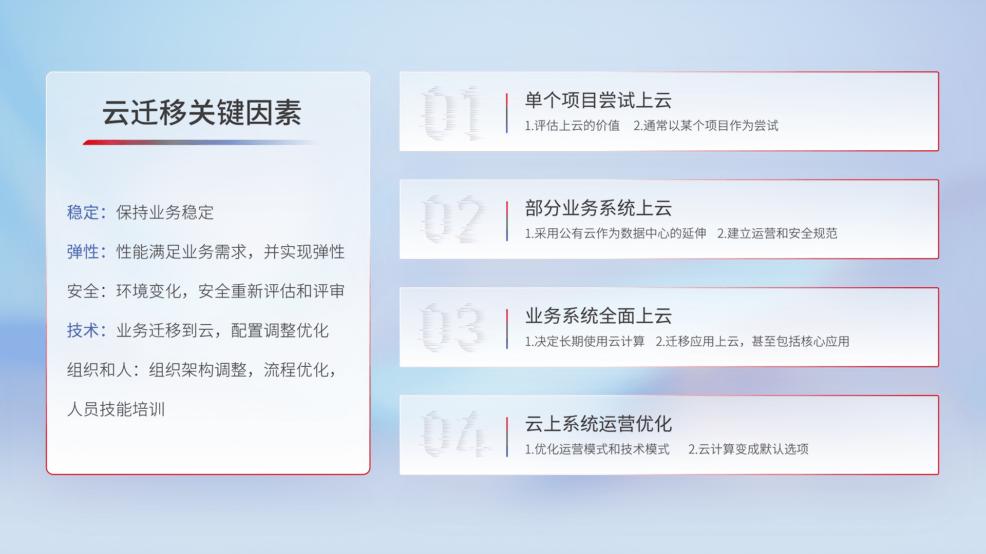 结合实际业务,,,,从规划设计、、云平台选型、、云原生改造、、、数据迁移、、集成交付,,,迁移全过程为客户识别最佳上云路径,,,做好风险识别管理,,设计网络架构、、、身份权限、、、安全审计合规、、、、操作审计、、、日志审计、、、监控告警策略、、、、多站点容灾设计等,,,对云上基础设施进行整体规划,,,,提升IT治理水平,,,以满足弹性、、、高可用、、、高性能的需求。。。