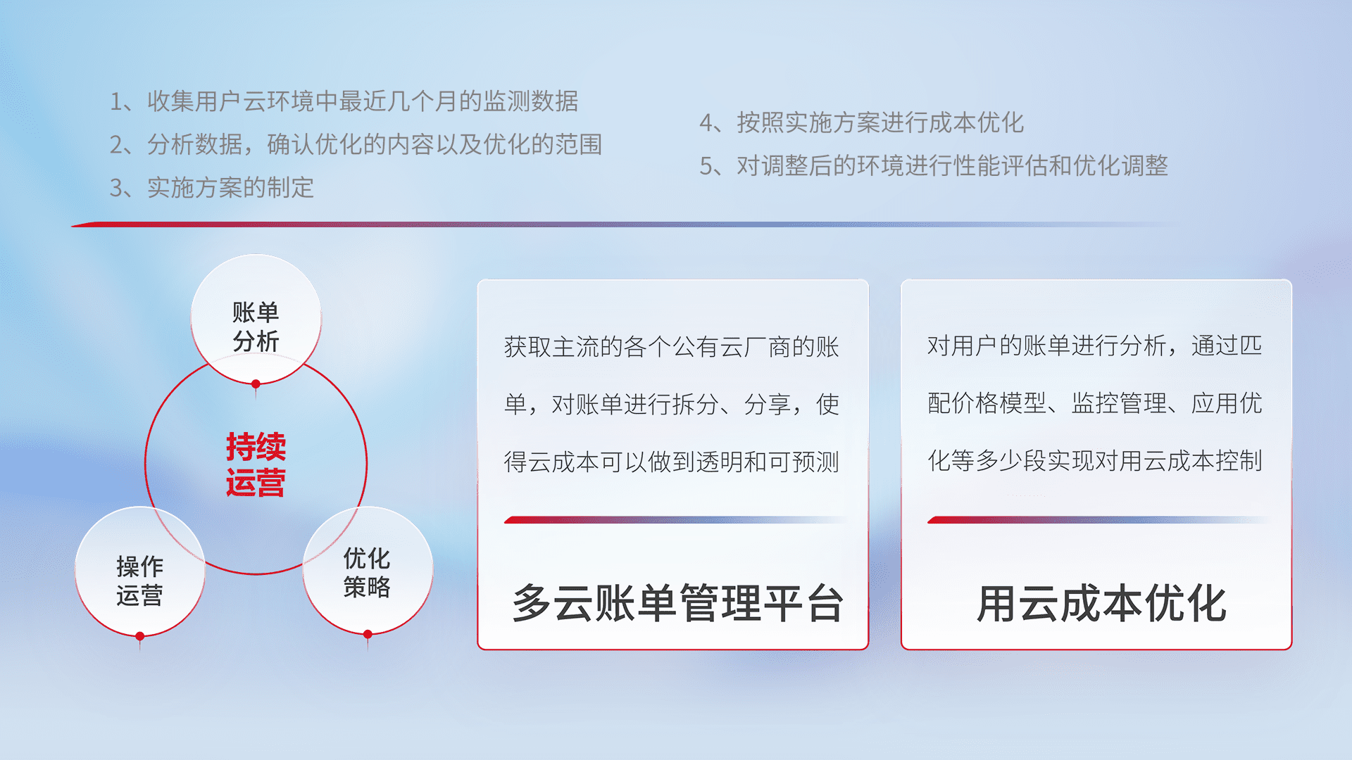 通过多云纳管,,,以统一的资源数据模型把客户的云资源进行抽象和封装,,,,进而实现对多云资源的统一操作,,保障云资源管理的可靠性、、、、稳定性与可用性。。量身定制化运维内容,,,,配置、、、、开发运维、、、补丁管理、、、、备份、、、、监控、、、认证和访问管理、、、、审计和日常巡检等,,,保障在用云过程中的可靠度,,,,稳定度以及高可用率。。。